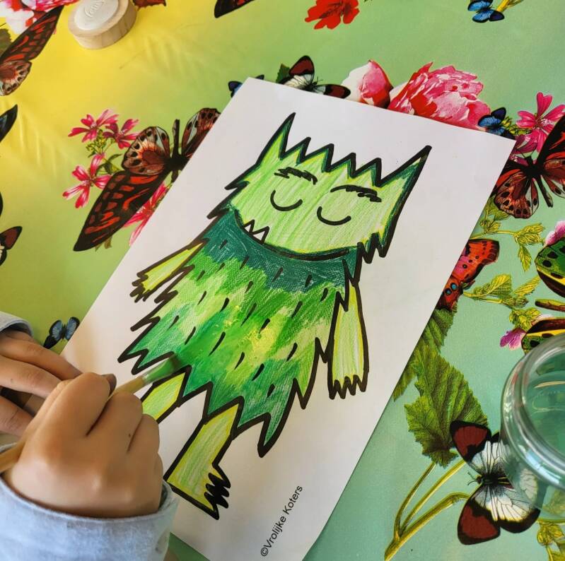 Het roze kleurenmonster hebben we met roze pastelkrijt ingekleurd. Ik heb hierbij de nadruk gelegd op: lief zijn voor jezelf.